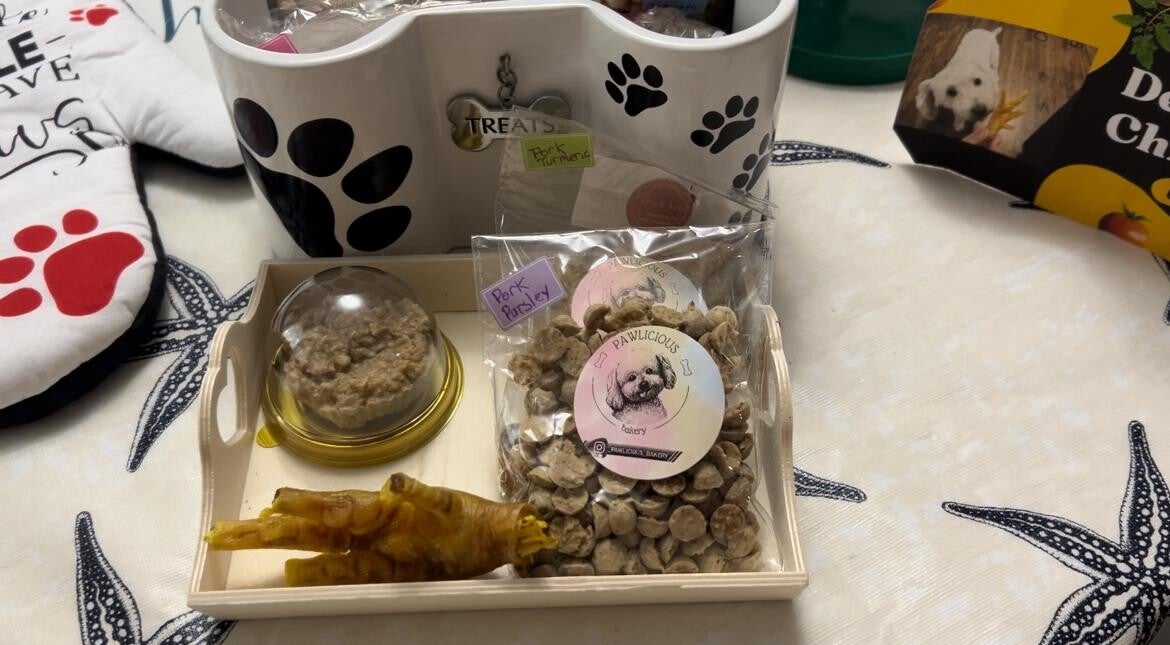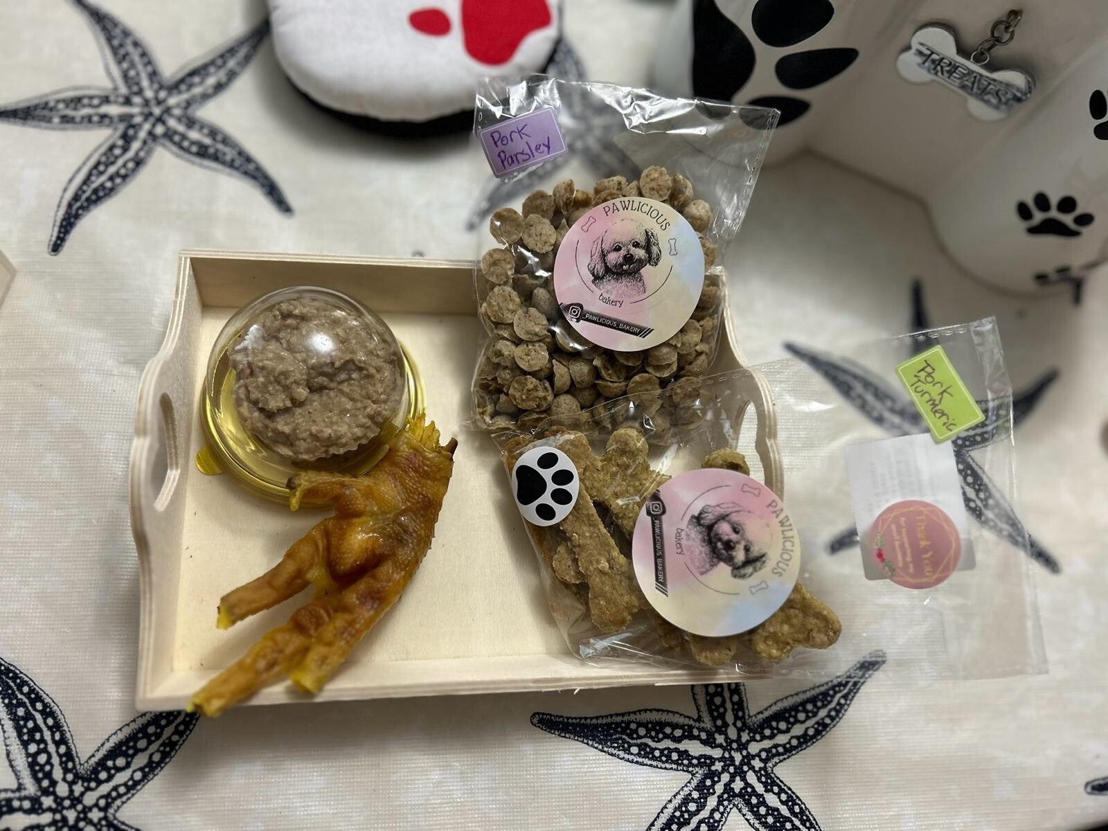 Treat your furry friend to the Allpaws Box. It includes a dehydrated chicken foot, a bag of treats, a bag of crackers, and a muffin. Perfect for rewarding your pet and showing them some love!